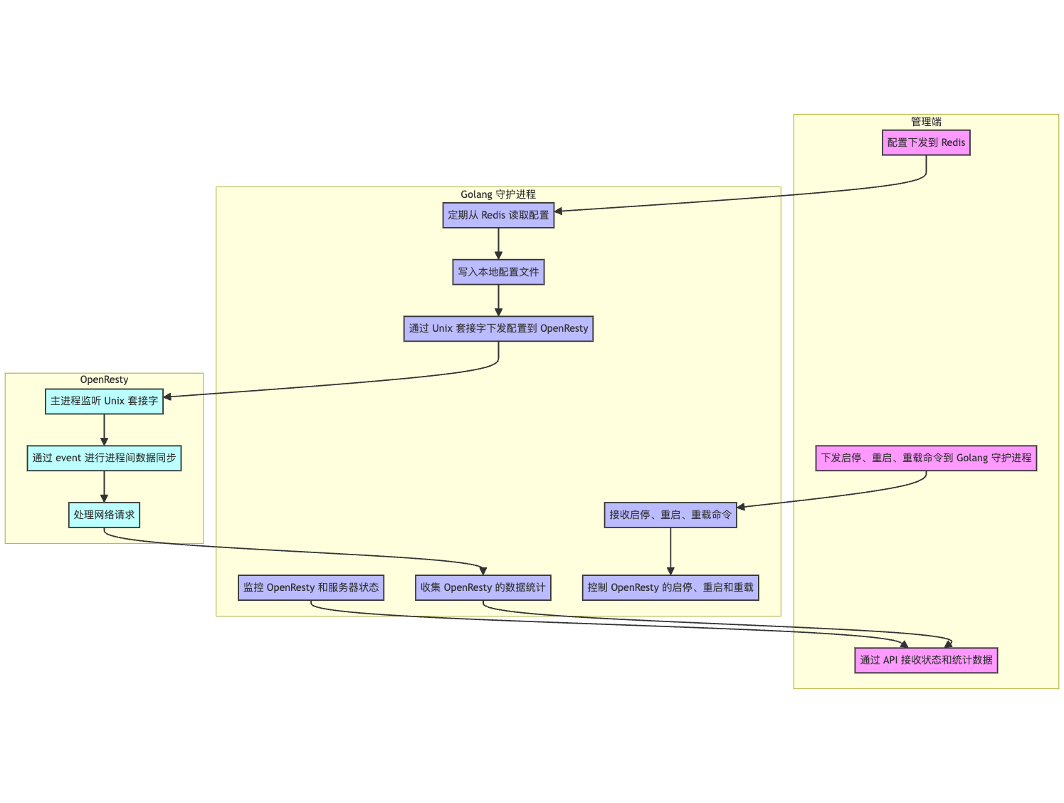 • 通过 Unix 套接字将新配置下发给 OpenResty,实现实时更新。